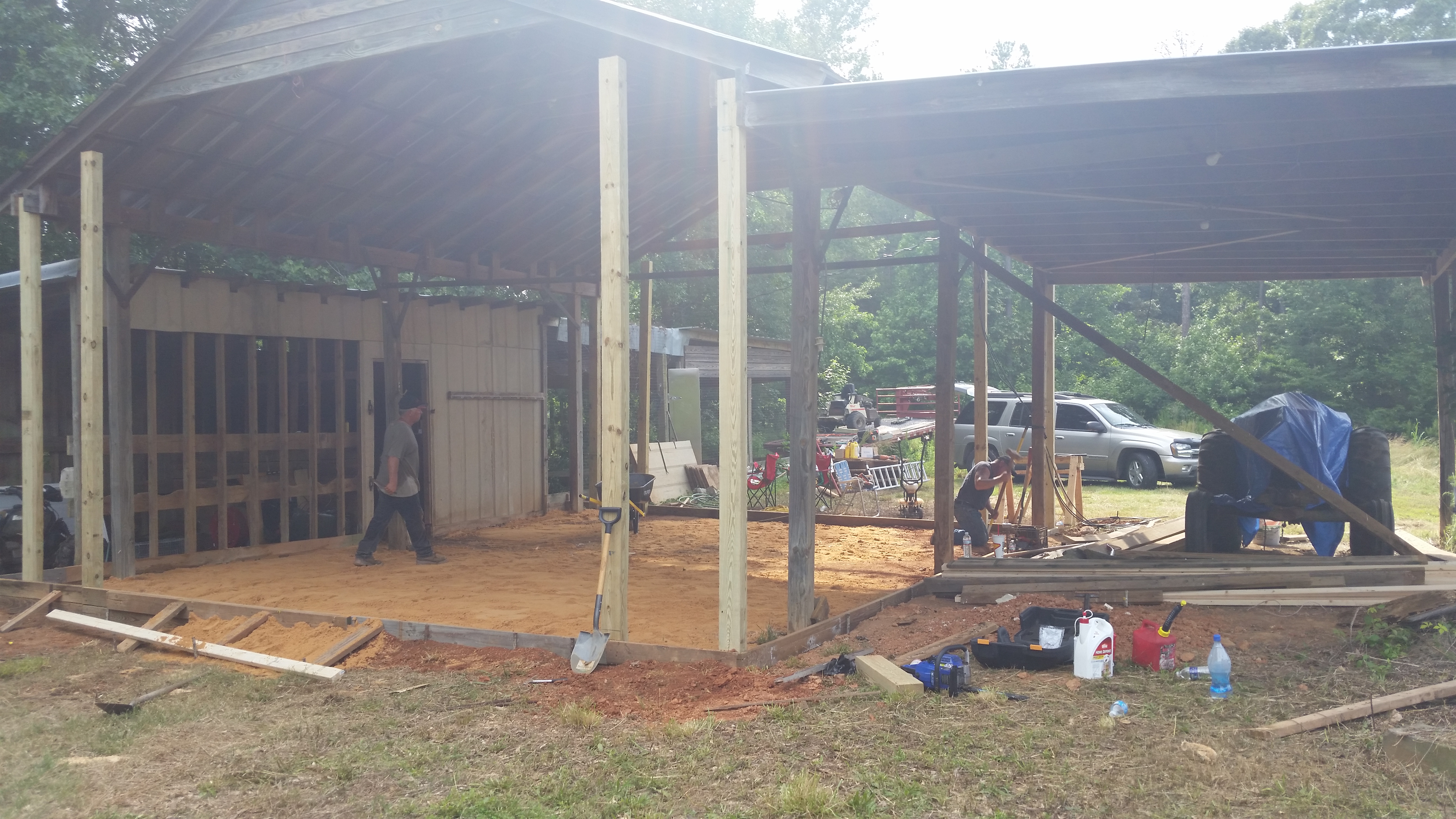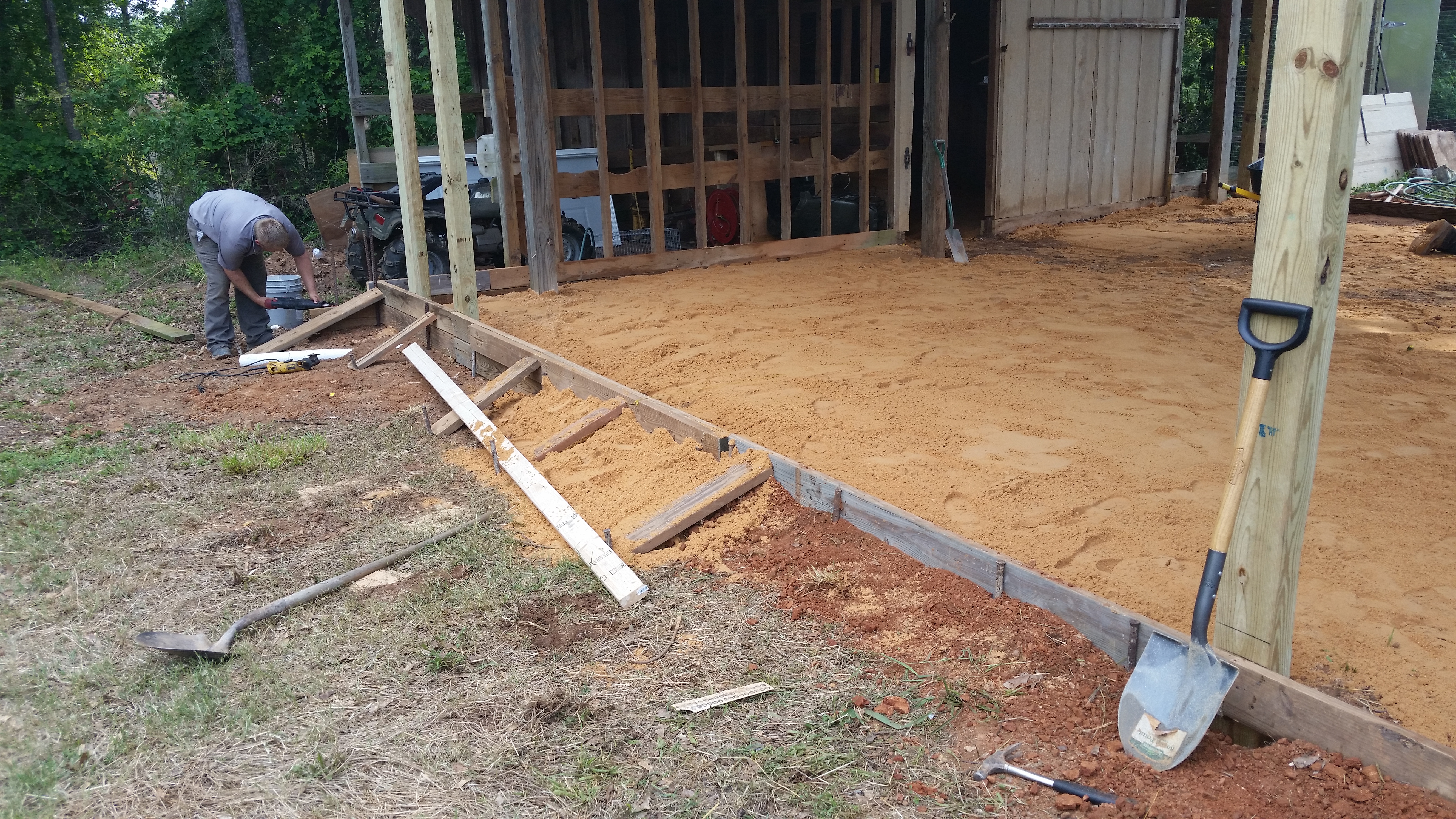 We moved 6 tons of sand into place to level out the floor of the barn. One corner was just drastically lower than the rest of the barn. It’s 6″ of concrete across the floor, sloped to the drain in the middle.