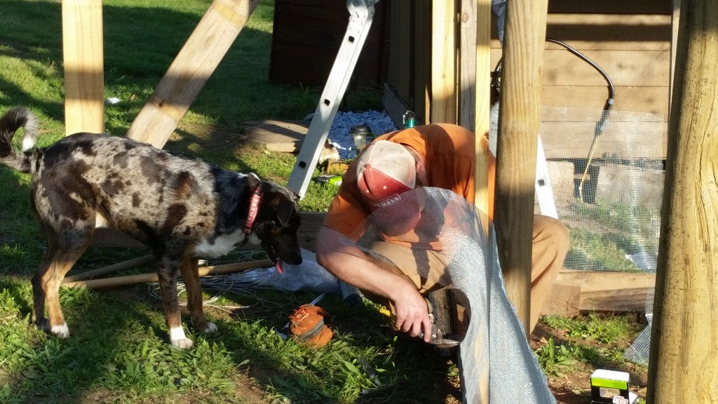Chicken coop construction still going, it takes a surprisingly long time to place hardware cloth properly. We used 1/4″ hardware cloth all along the bottom. Hex poultry netting to go around the entire structure, and criss-cross of wire on the top for hawk protection.