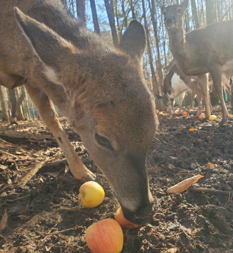 Christine’s Story: Christine was named after the rehabber that drove hours to transport her to us. She is completely blind because was born without eyes. Her mother must have been an awesome mother to not have abandoned her at birth which usually is what happens. She was found alone at two weeks old. That is the age that fawn start following their mother instead of just bedding down, so I think this is when they lost track of each other. Her mother also taught her “stranger danger”. It took weeks of her kicking and fighting me and many bruises everytime I had to give her the bottle but one day she finally trusted me enough to take the bottle. She would follow my voice to drink her bottle. Once she was weened she never wanted to be touched by humans but she does love to be groomed by the other deer. So we just leave her be, no touching and I just talk to her so I do not startle her if I need to be near her. God gave her extra big ears to help her navigate. When I talk to her, she follows my voice using those ears like sonar. She is a sweet, beautiful girl.