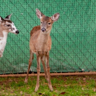 Honey’s Story: Honey was found by a farmer and fed an improper diet for a couple weeks (cow’s milk and honey). The man never realized that the fawn was almost completely blind. He had a fog over each eye either due to an infection or defency. He also had very upset stomach. He was treated for the blindness, etc. His vision improved slightly but not good enough to be released into the wild.