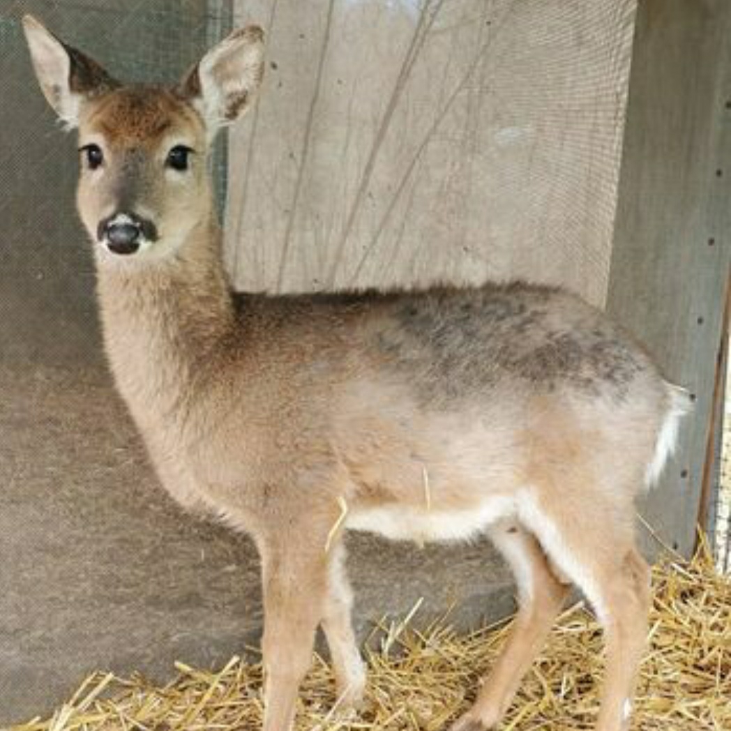 She came here when she was a few months old. Pebbles was rescued by a nice lady that cared for her previously then she came to our rescue. She is non releasable because she is a dwarf piebald deer with deformed hooves. She holds a special place in my heart because she is the 1st nonreleasable fawn that had to keep because of health issues. Pebbles is a sweetheart.