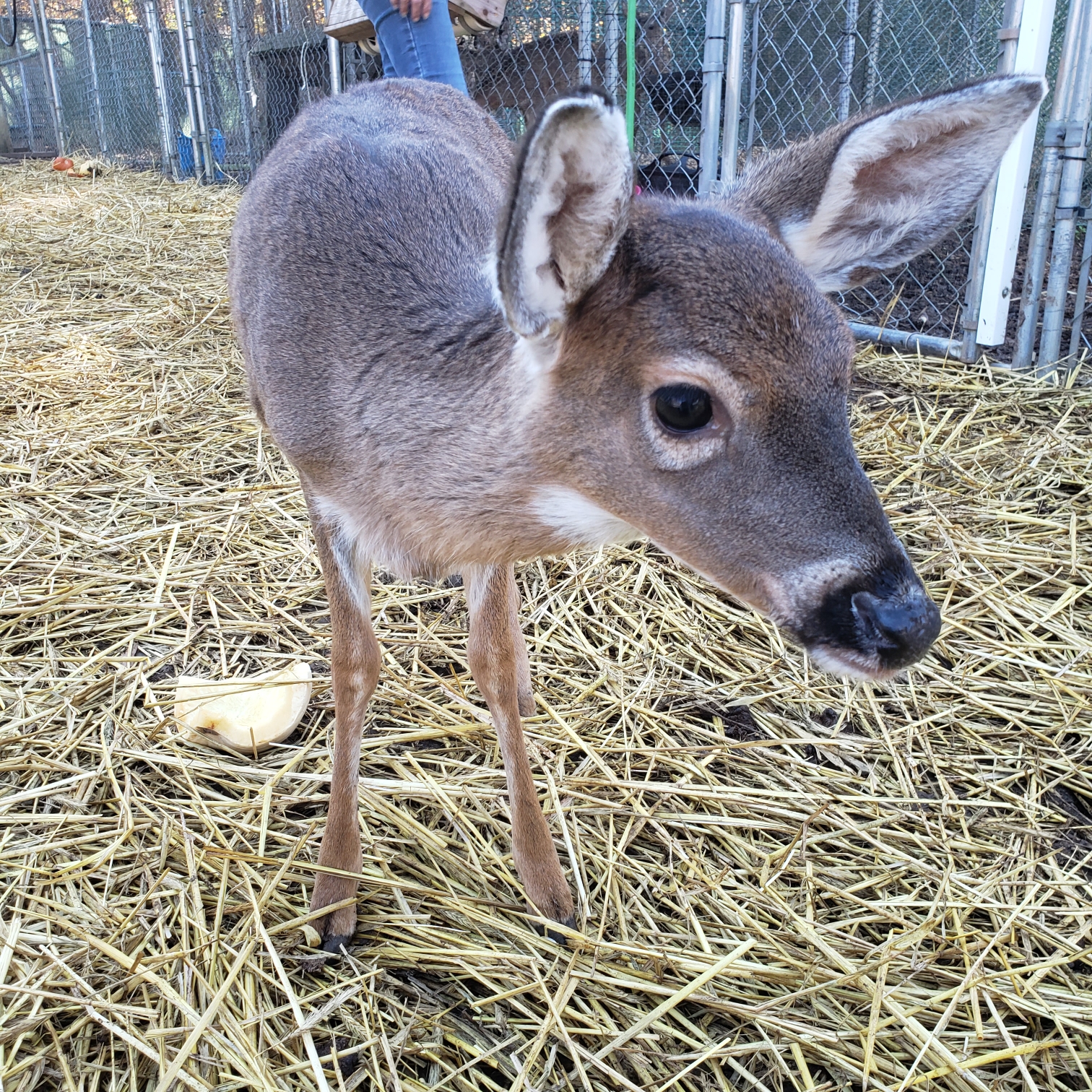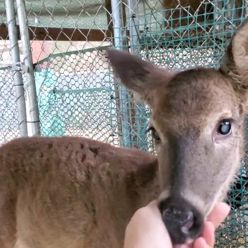 Ester was found after a doe was hit by a car. She imprinted on her finder and then her finder moved. She has a forever home at Magnolia Fawn Rescue.